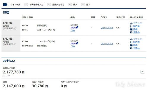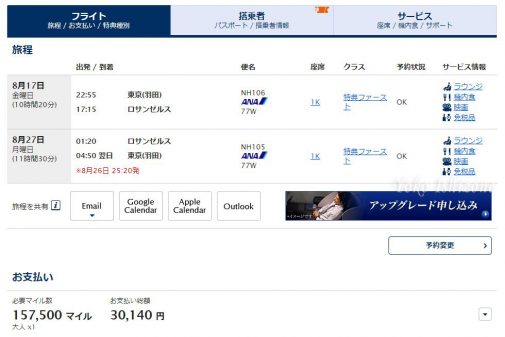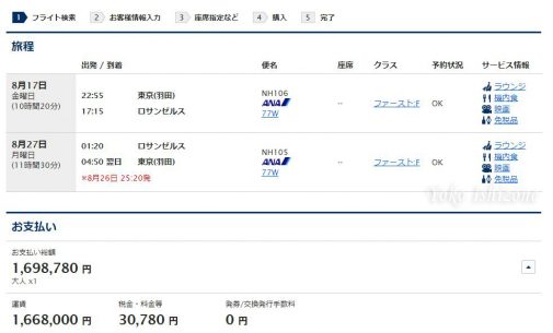 ロサンゼルス行きのファーストクラスをANAマイルで予約