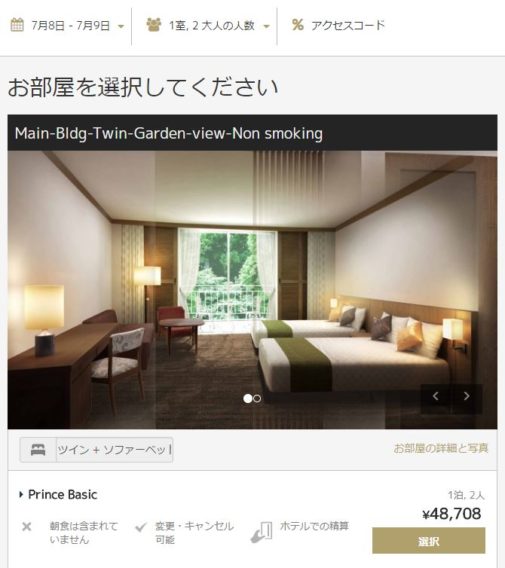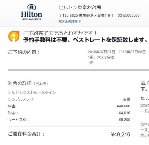 たとえば、7/7-8にヒルトンルームを予約すると、40000円+サービス料+税=49216円です。