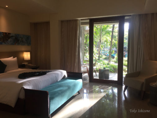 ベランダからプールが眺められて、そして、バスタブもベランダにあるお部屋でした。1人で泊まってたので、バスタブがどこにあっても、そんなに気にならないけど、友達と一緒だったら、お風呂に入りづらいお部屋でもあります。