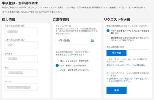 チェックアウトしてから10日過ぎても宿泊実績がカウントされていない場合、マリオットリワードに、はやくカウントしてくださいって申請することができます。