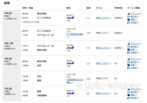 こちらも、マレーシアまでのフライトチケットをマイルを使ってビジネスクラスで予約したときのものです。