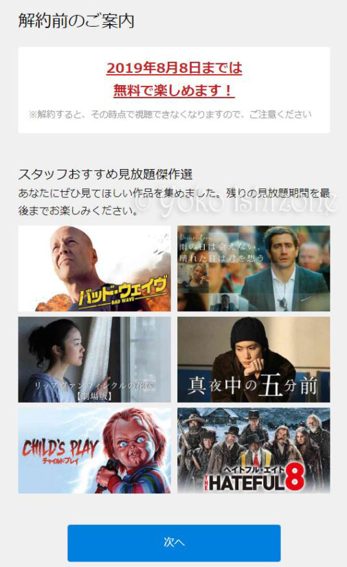 解約理由のアンケートに答えて「次へ」で解約完了です。
