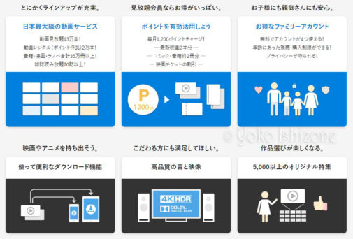 最新作の映画の有料レンタルや、マンガや本の購入、NHKオンデマンドの月額料金、映画館のチケット割引にも使えます。
