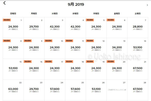 このホテルに泊まりたいっていう希望があれば、日付指定をしないで、そのホテルの1ヶ月の部屋の値段をチェックします。