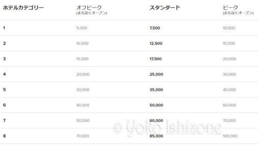 今は、カテゴリー毎にポイント数が決まっていますが、2019年9月14日から、オフピークとピークの時期によって、同じカテゴリーでも必要なポイント数が変わってきます。
